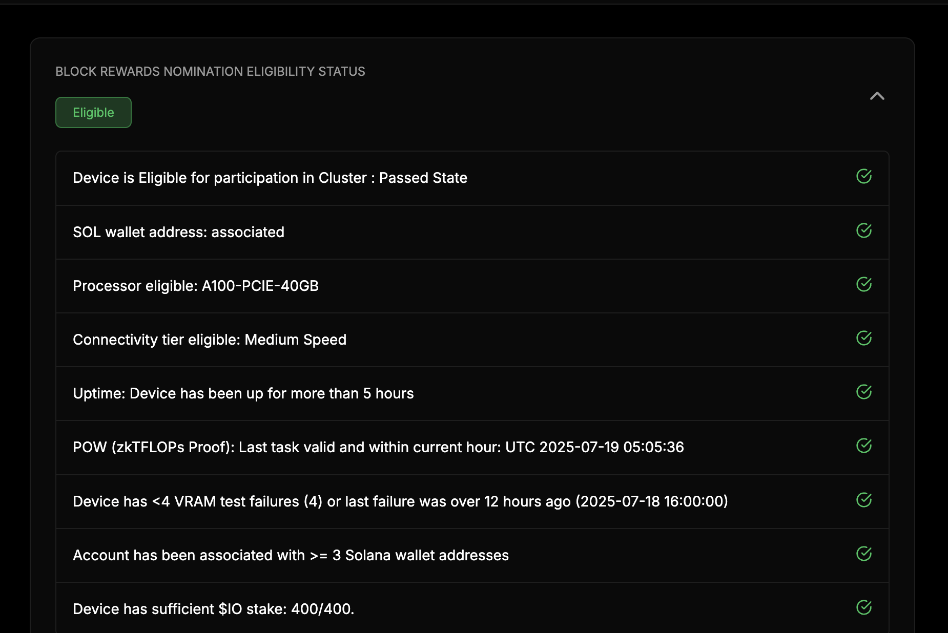 Click the caret on the right side of the status row (Eligible in the example) to open the Block Rewards Nomination Checklist. Each step of the verification status is displayed, with a green or red check that indicates success or failure. The checklist displays the current status of the device’s eligibility for a block reward. In the example case below, if a new block was opening, this device would be eligible. The Block Rewards Nomination Checklist is designed to offer total transparency into the Block Reward nomination process.