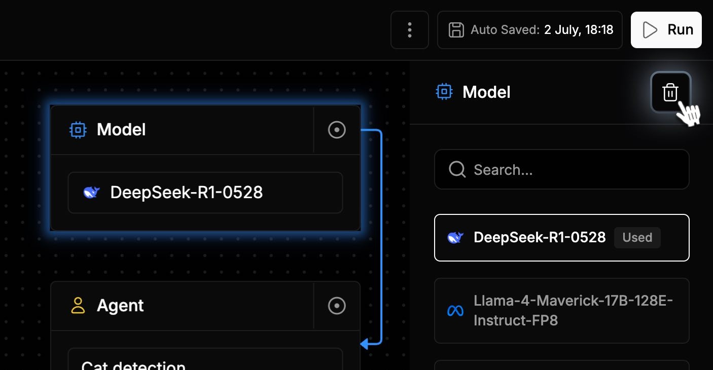 Attach an AI Model to the Agent by clicking into the component and choosing from the available models in the right sidebar. This defines the core reasoning engine your agent will use.- Click Add Component → Select AI Model