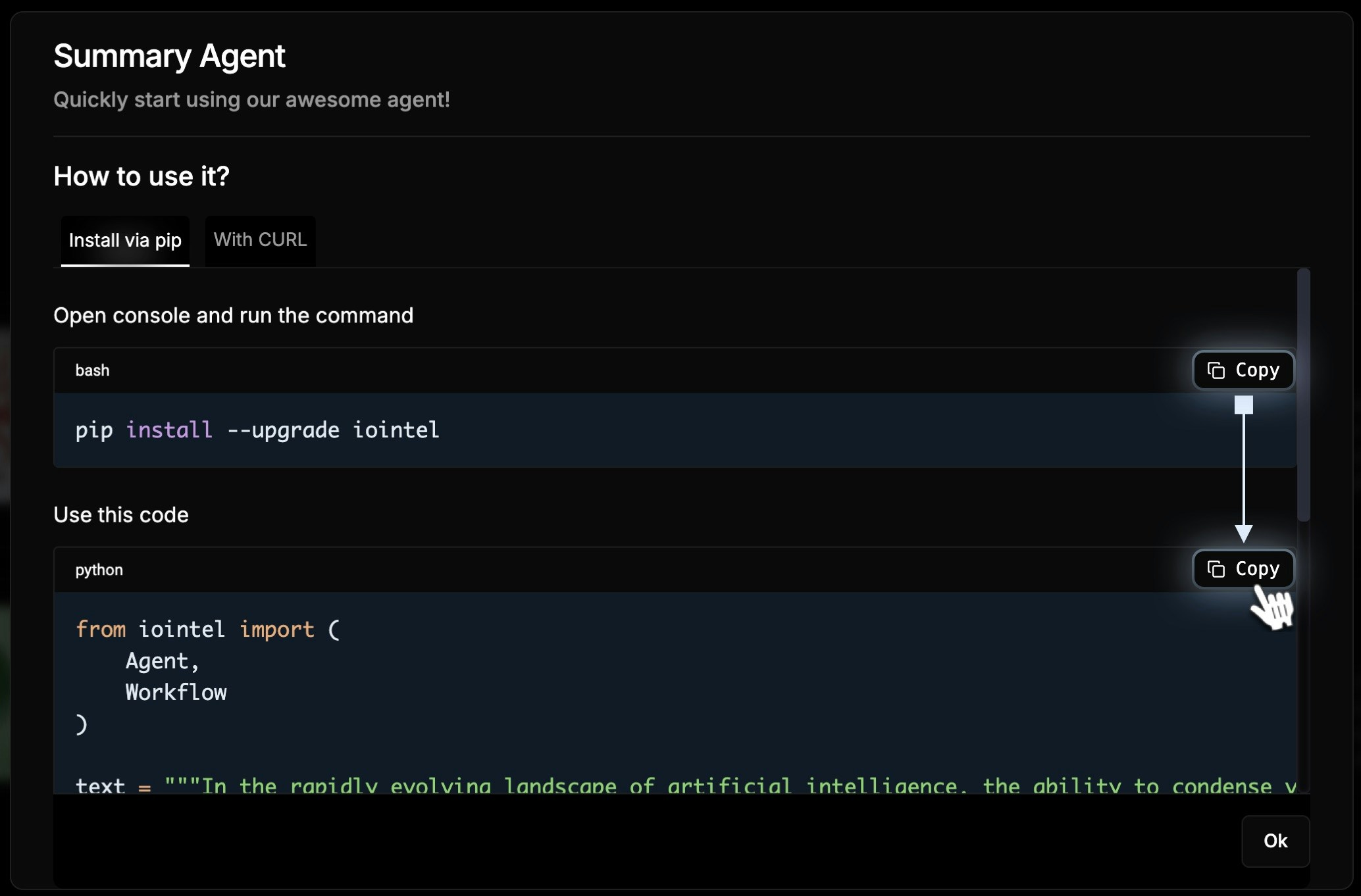 - Use the following Python example to start using your selected AI Agent: