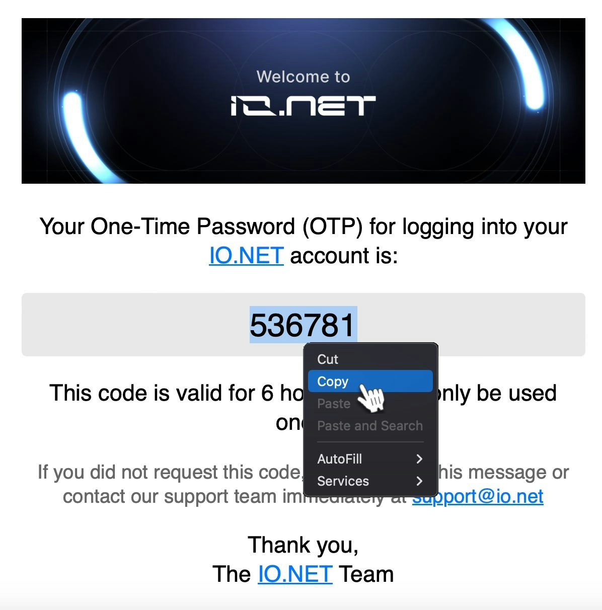 Open the email from io.net with the subject “Login to io.net”, copy the large numeric code provided in the email.