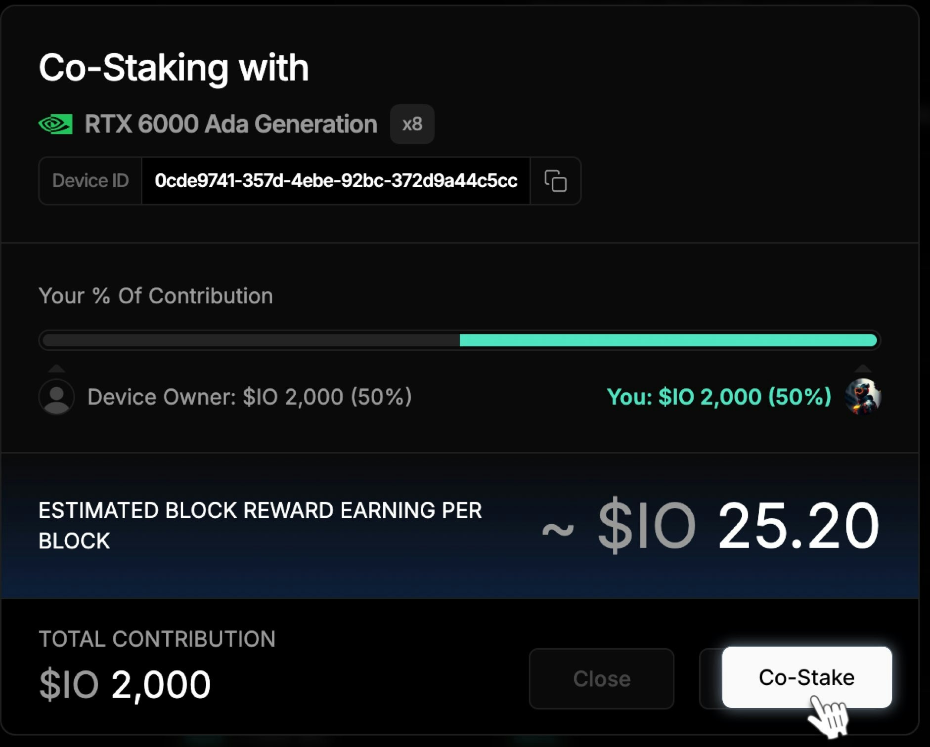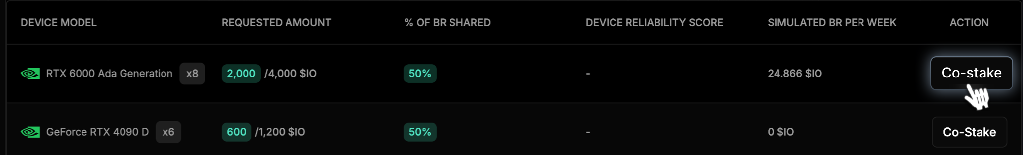 Co-staking allows third parties to stake on devices and share block rewards.Devices failing to meet IO.net criteria may result in slashing, affecting rewards and principal.