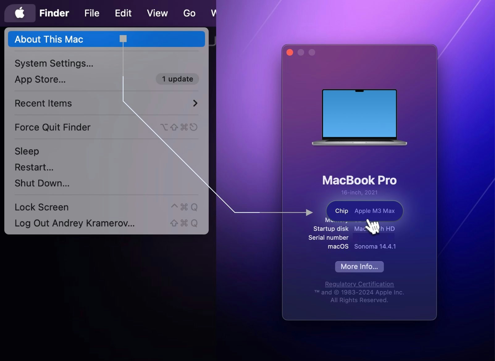 We currently only support Apple chip processors (M3, M4). All currently supported processor and video card models can be found here. To check your Mac processor: