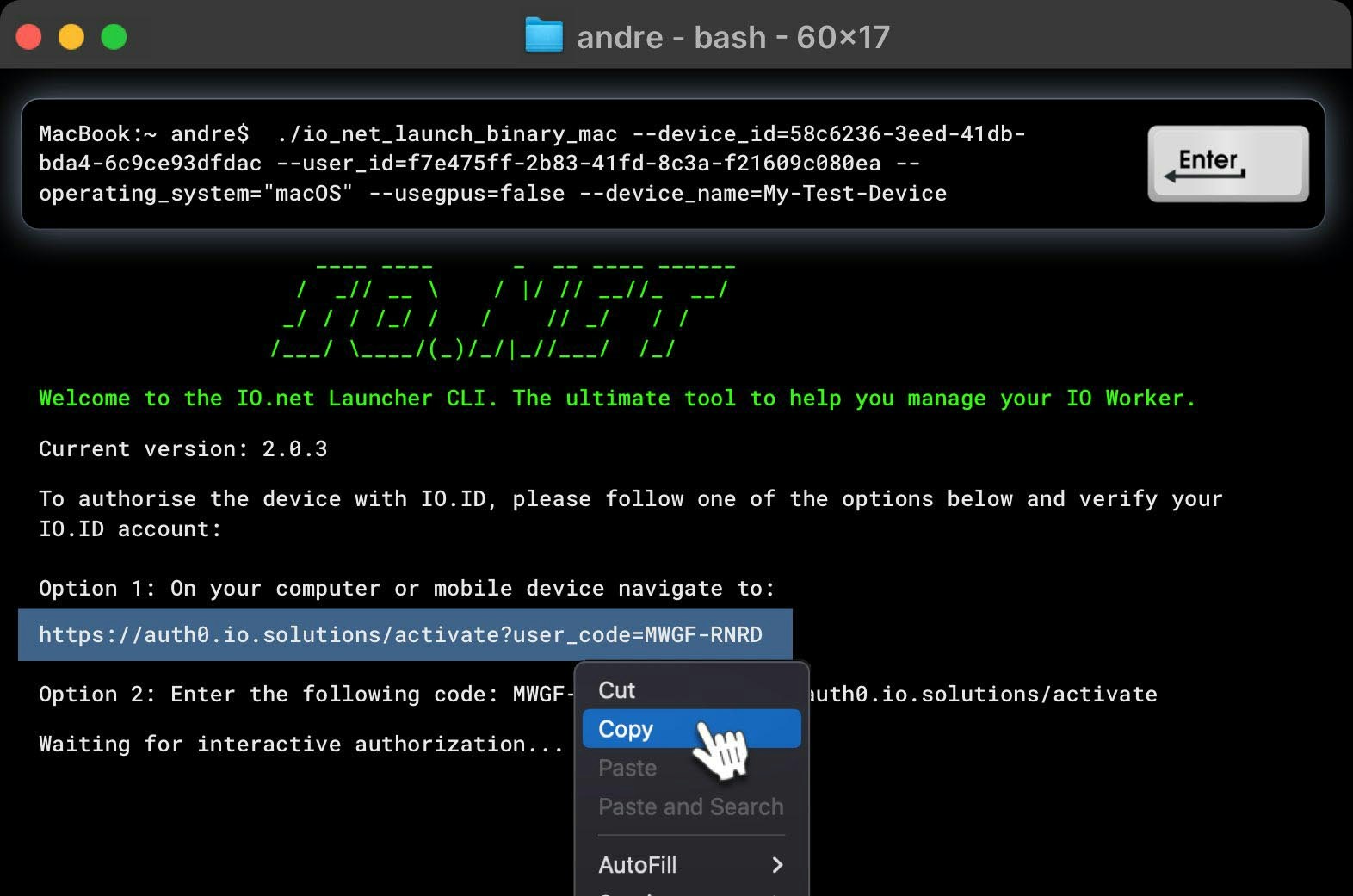 The IO Binary may prompt you to authorize your new device.Remember, you have 3+ minutes to complete the authorization of the device. If you miss it, rerun the code again.
