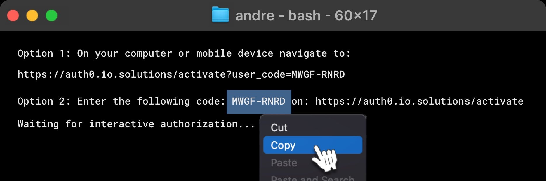 Enter this code on the page https://auth0.io.solutions/activate to authorize the device. You will be prompted to log in.
