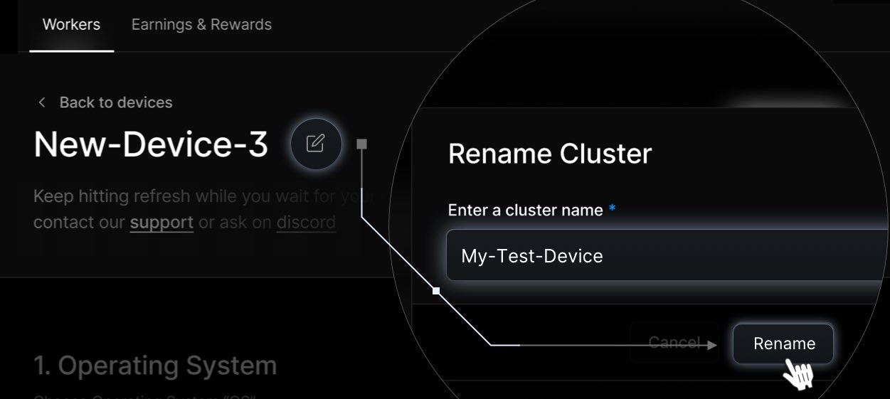 Click the “Pencil” icon to open the popup for editing the device name. Please add a unique name for your device. An ideal format would be something like this: My-Test-Device