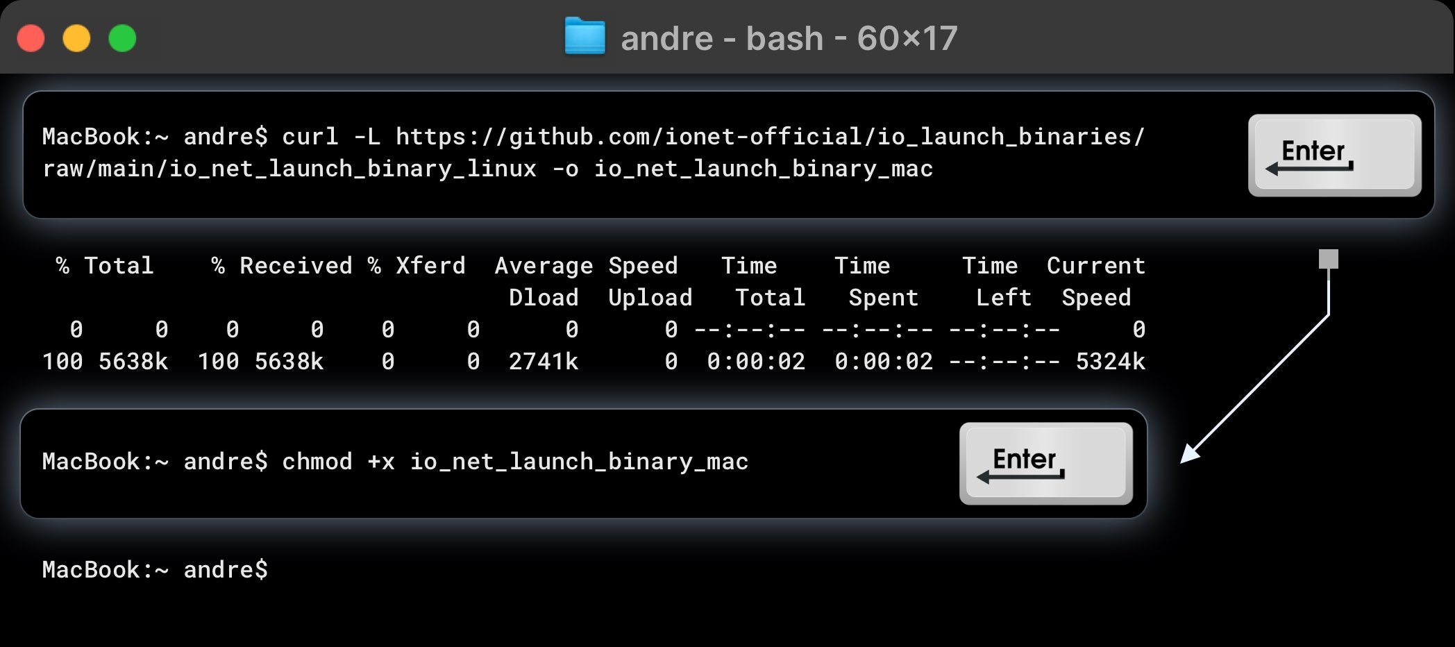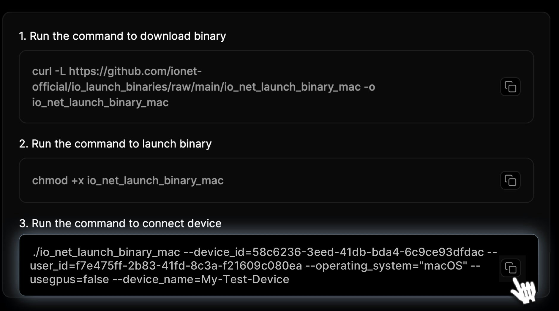 Copy generated the IO Binary address provided in the wizard and past it into Terminal to run further: