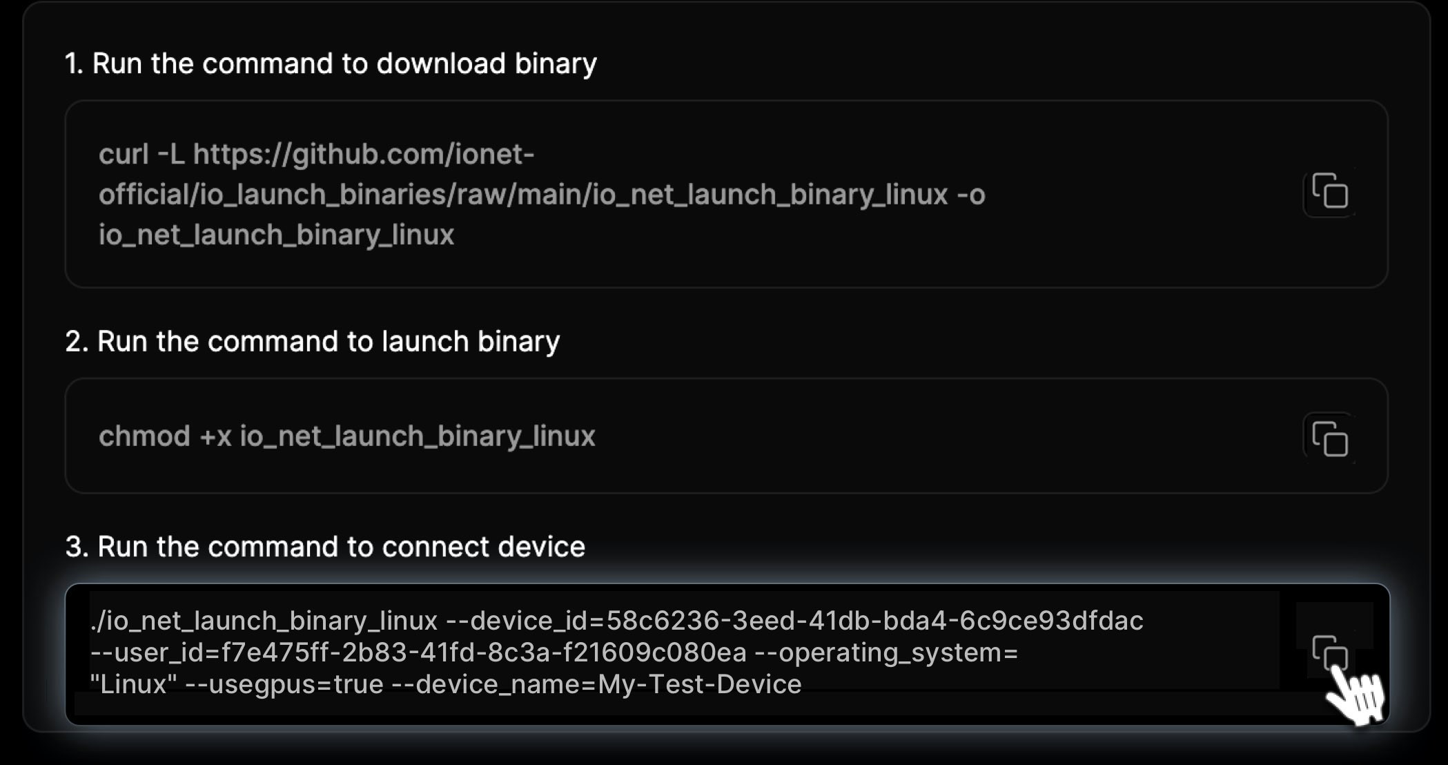 IO Binary is a compiled executable file used to perform computational tasks and manage system operations. It is crucial for the smooth operation of the platform as it handles essential functions directly related to the performance and reliability of the computational resources.Do not modify or run code directly in io.net’s docker containers. This may disqualify your device from earning block rewards or being hired. If you have suggestions or ideas for custom code in our Docker containers, contact customer support to suggest them.