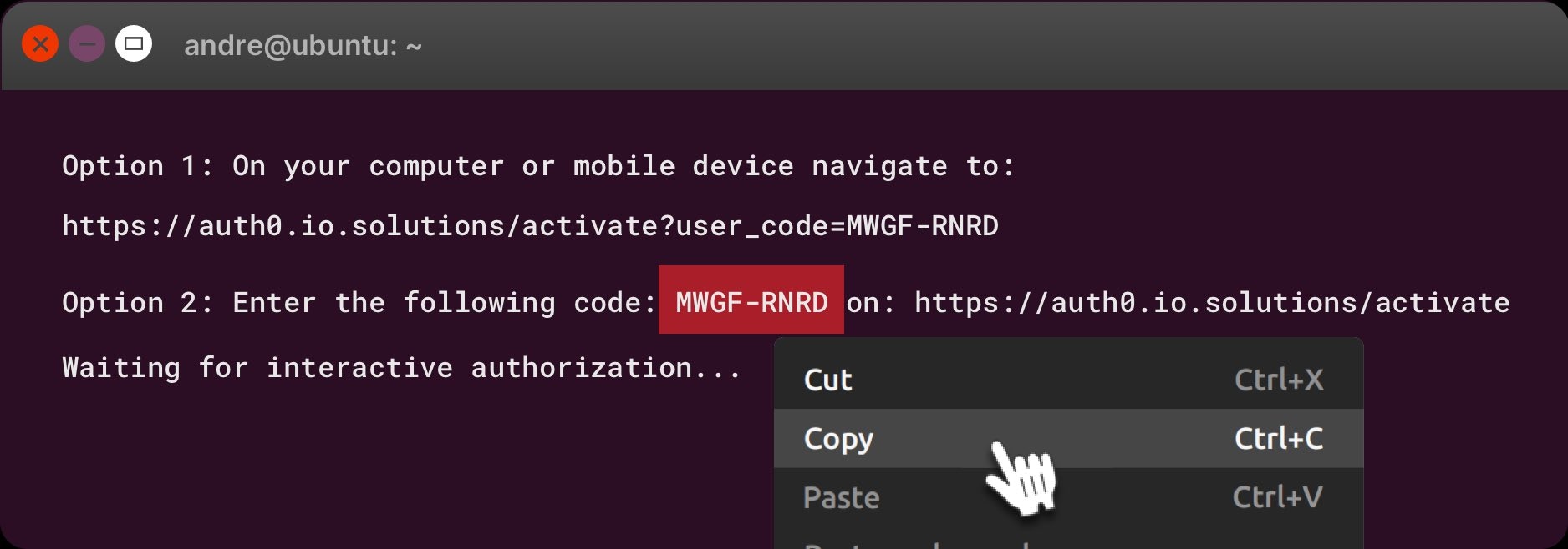 Enter this code on the page https://auth0.io.solutions/activate to authorize the device. After it, the system will prompt you to log in.