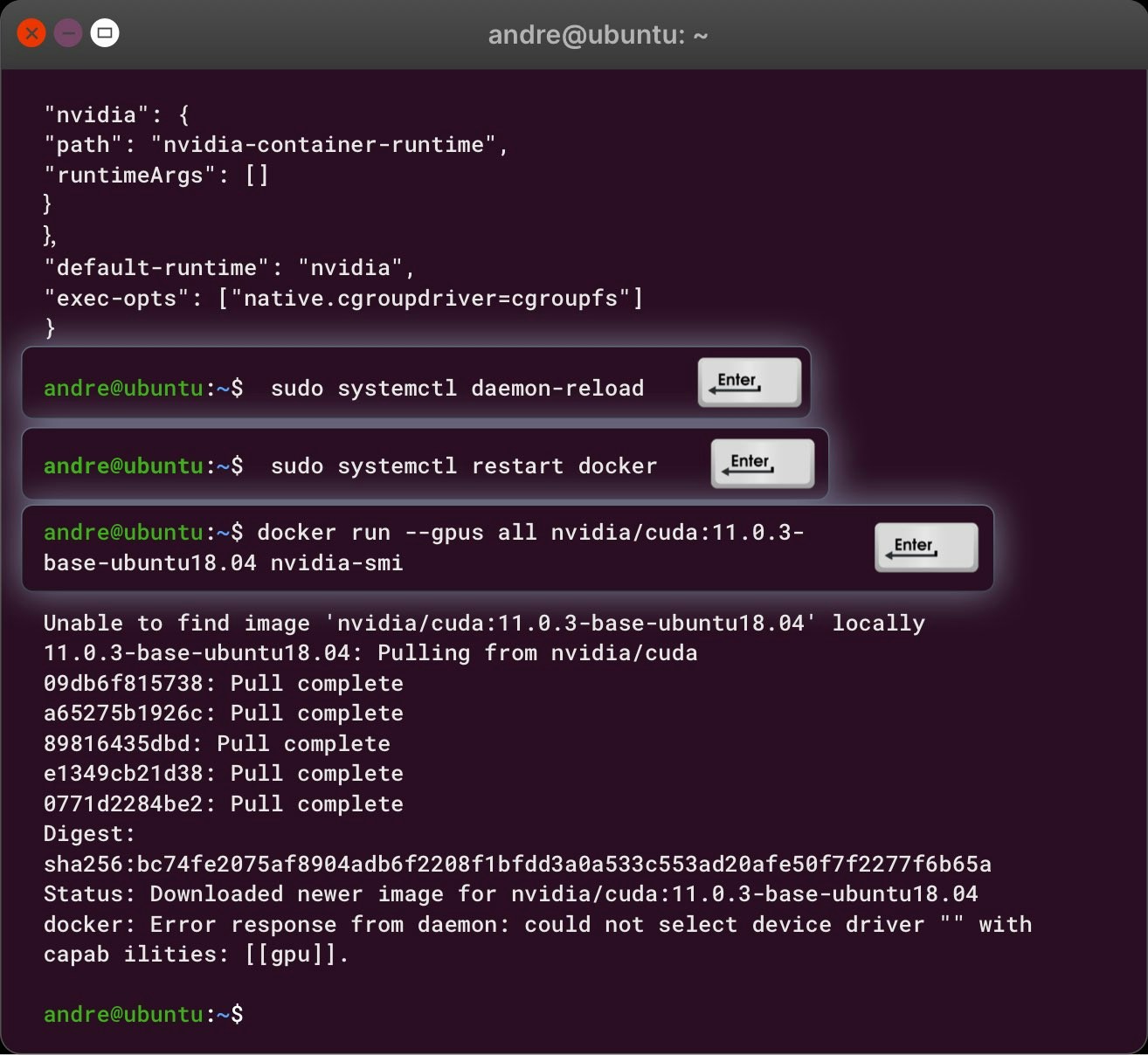 If nvidia-smi output is visible, Docker can use the GPU inside the container. If not, try restarting Docker Daemon:Else there might be some error similar to the following: